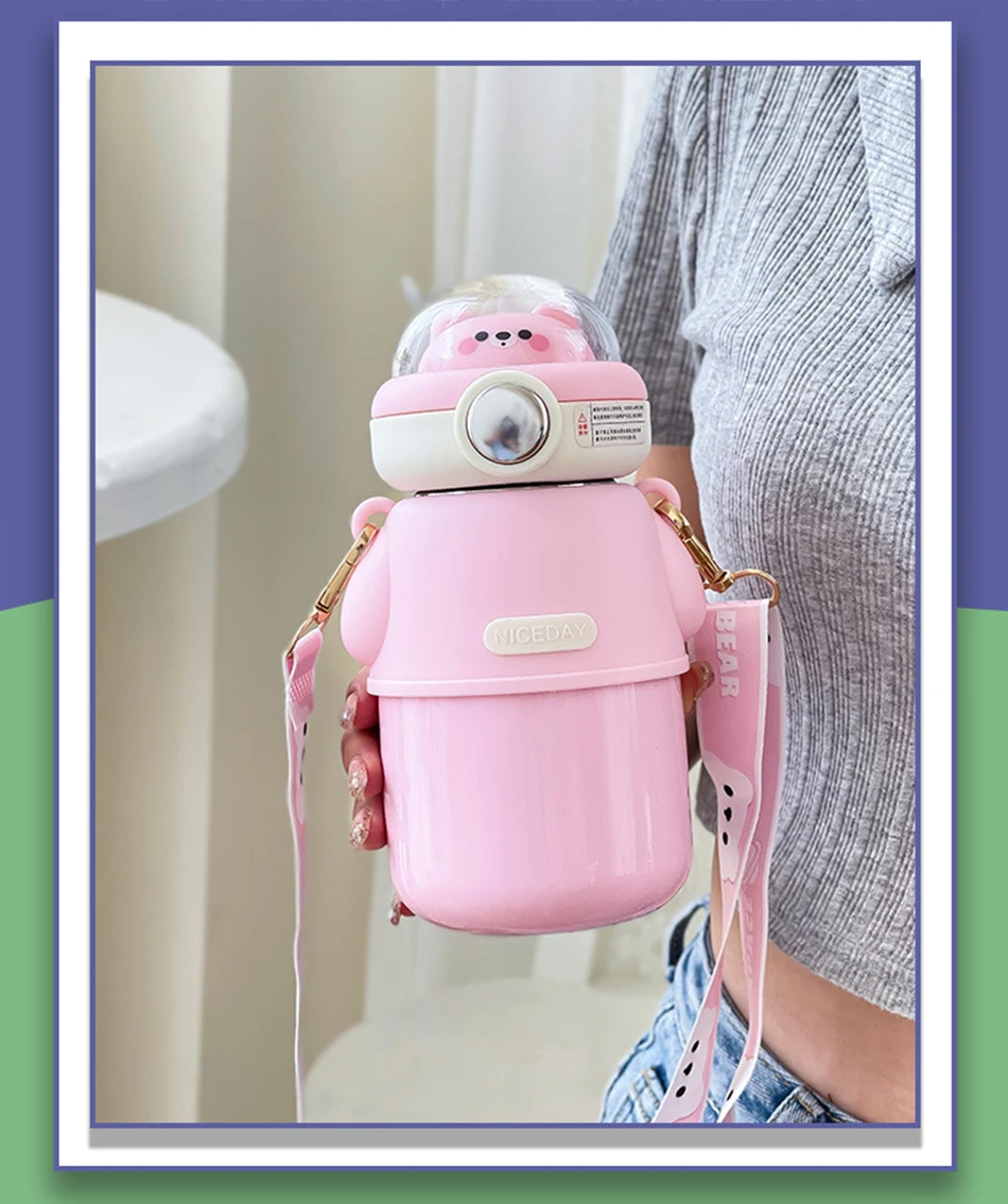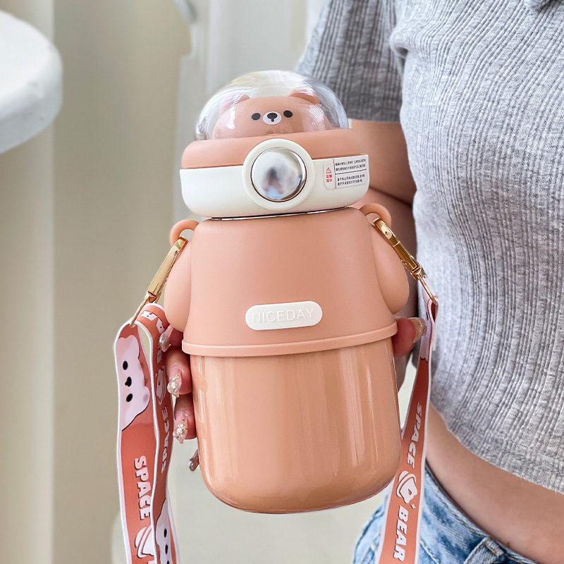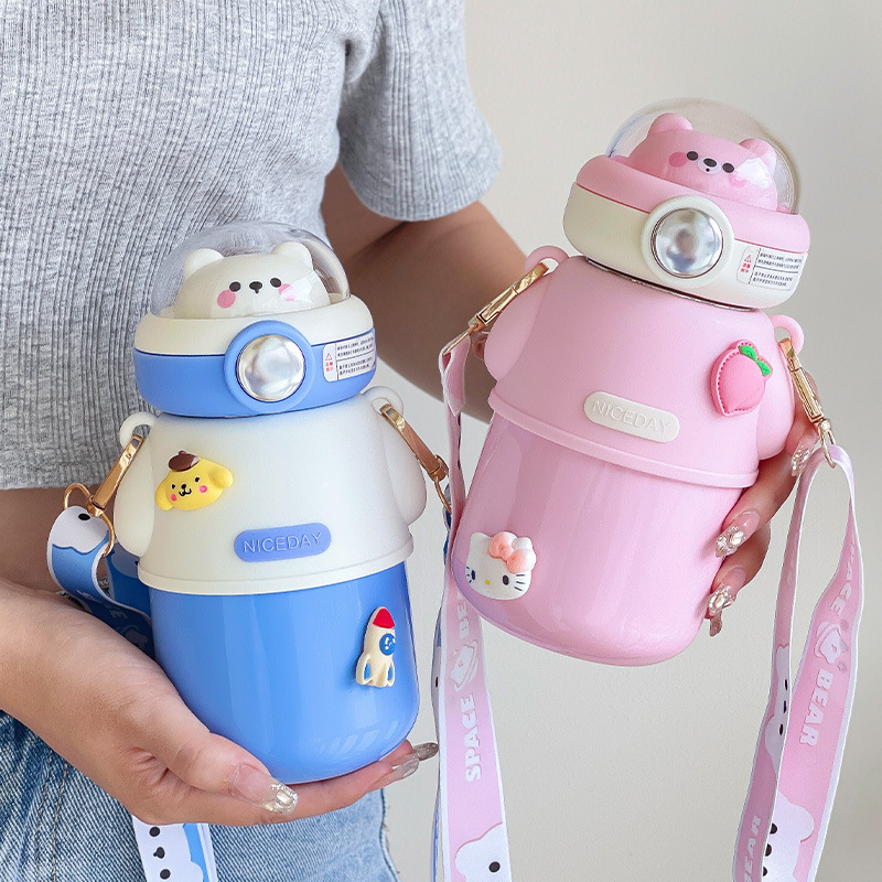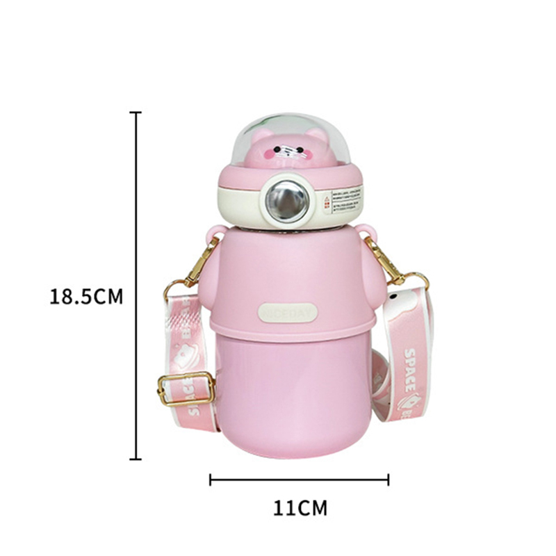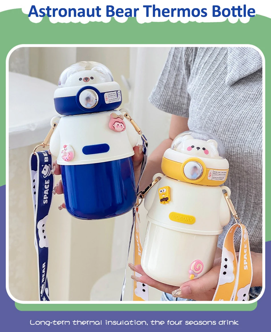 Cute Astronautics Bear Thermos Water Bottle With Straw For Kids Girls Portable School Stainless Steels Insulation Water Cup 500ml